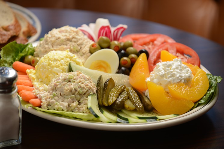 This salad is so big, it has salads on salads on salads — literally. Everyone knows delis serve hefty helpings of the items on their bible-length menus, and the salads are no exception. Here we have a perfect specimen of a deli-big salad. While a salad in itself, it also includes chicken, egg and tuna salads on a bed of tomatoes, cucumbers and carrots for crunch. Rounded out with a mound of olives, sweet pickles and peaches with cottage cheese, this is a salad for the person who has to have a big salad but can’t quite decide on one direction.